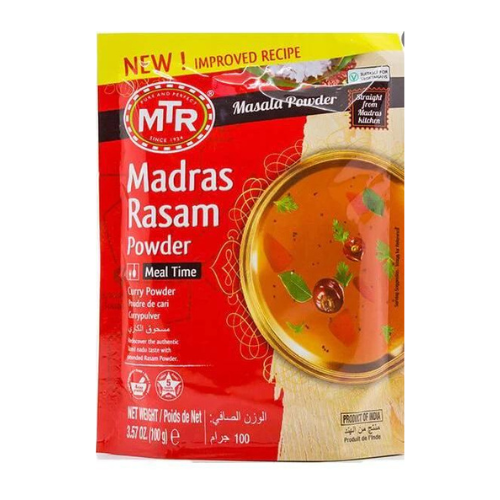 MTR Madras Rasam Powder 100g captures the authentic taste of Madras-style rasam – a peppery, tangy South Indian soup made with tamarind, tomatoes, and lentils. This premium spice blend from MTR features black pepper, cumin, coriander, and dried chillies for a warming, comforting bowl of rasam.