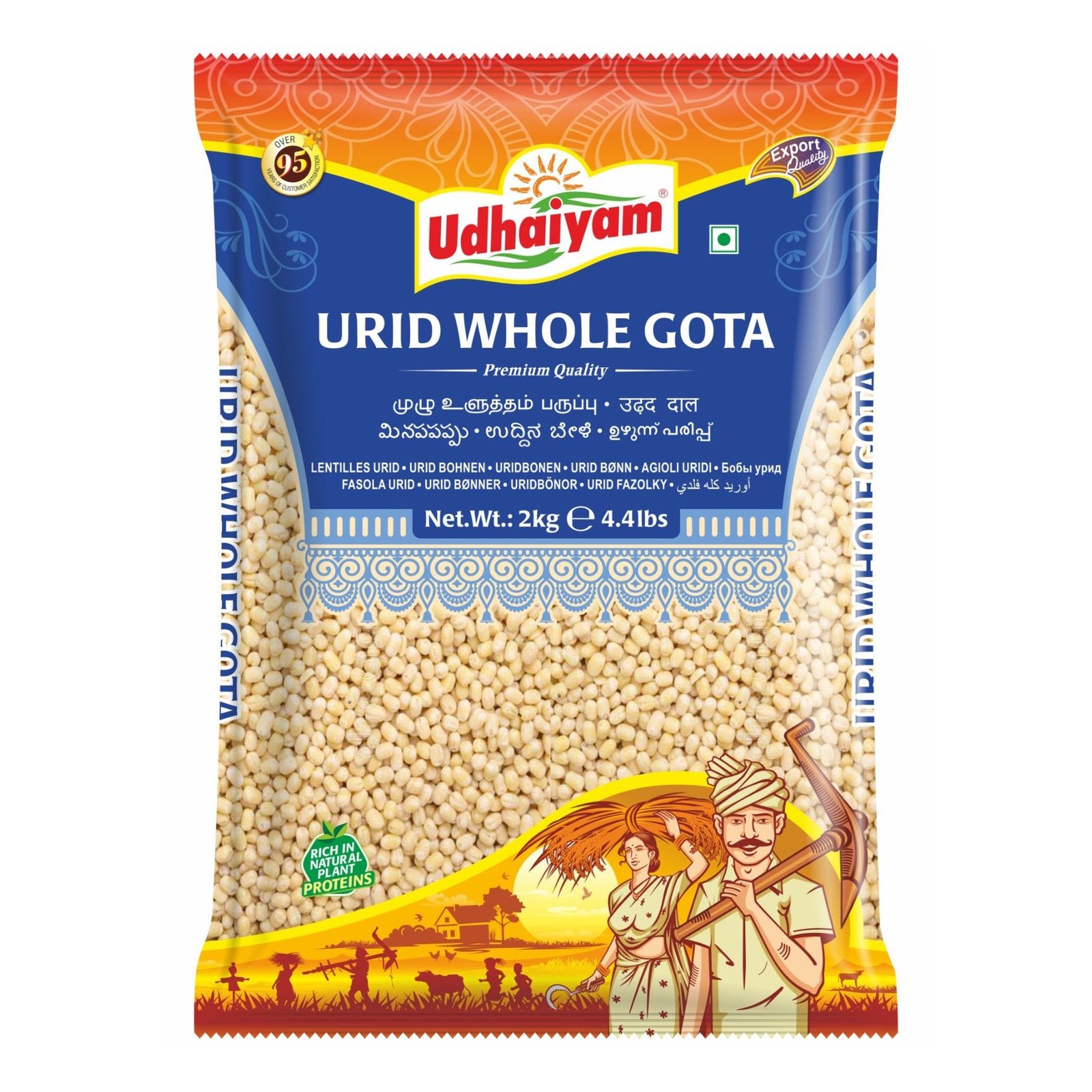 Udhaiyam Urid Whole Gota 2kg is premium quality whole skinned urad (white urad gota). Unlike split urad dal, gota retains the whole bean shape but with the skin removed, giving a creamier texture when cooked. Perfect for making creamy dals, vada, and festive dishes.